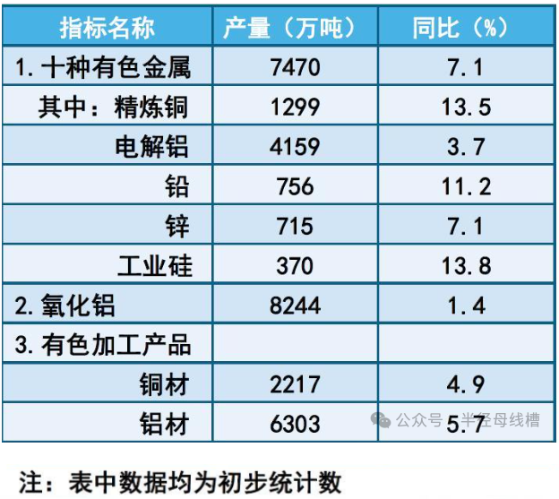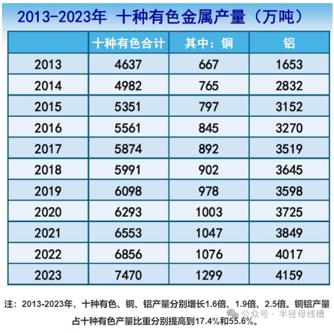 (一)十種有色金屬產(chǎn)量首次突破7000萬噸 注:2013-2023年,十種有色、銅、鋁產(chǎn)量分別增長1.6倍、1.9倍、2.5倍。銅鋁產(chǎn)量占十種有色產(chǎn)量比重分別提高到17.4%和55.6%。